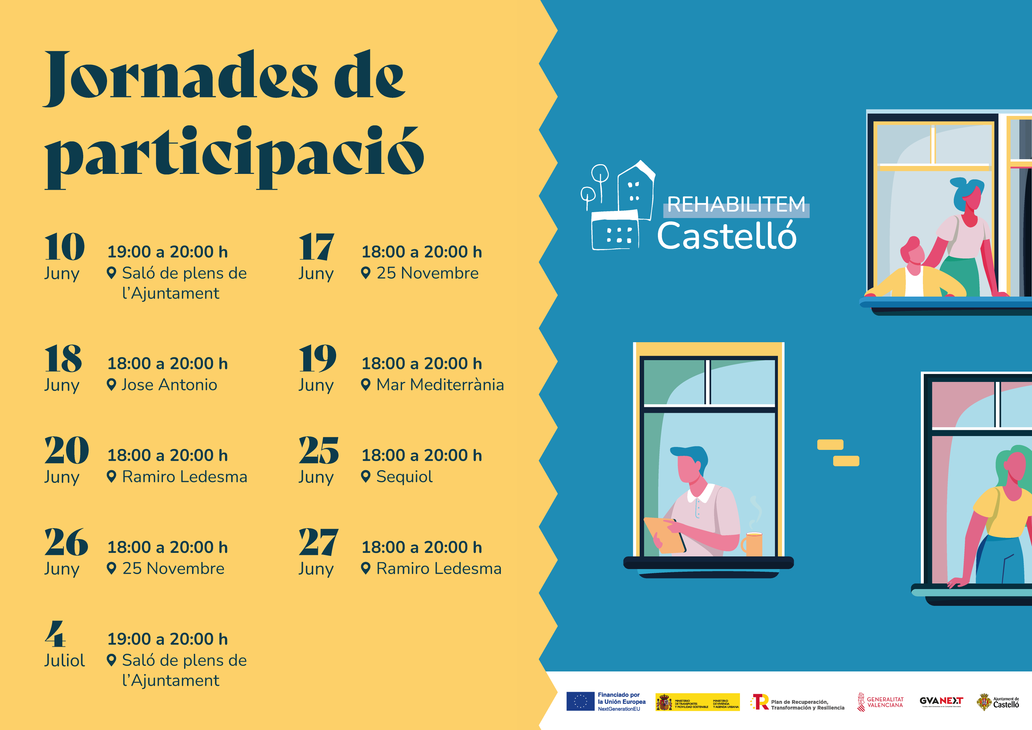 “Rehabilitem Castelló” és un projecte de l’Ajuntament de Castelló, que busca transformar la nostra ciutat i millorar la qualitat de vida de la ciutadania mitjançant la rehabilitació d’edificis, la millora de l’eficiència energètica i la participació veïnal. Finançat pels Fons Next Generation en el marc del Pla de Recuperació, Transformació i Resiliència (PRTR), i l’aportació de l’Ajuntament de Castelló, subvencionant el projecte al 100% a propietaris i propietàries.